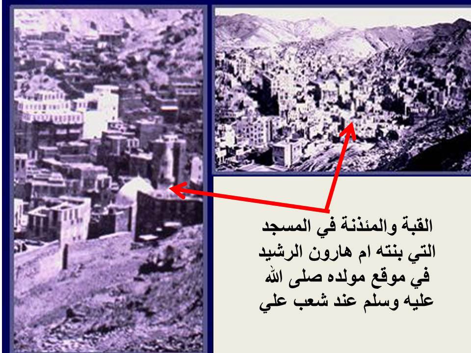 فبنى داره التي يقال لها دار ابن يوسف، وأدخل ذلك البيت في الدار، حتى أخرجته الخيزران فجعلته مسجداً يصلى فيه) (الجزء الثاني ص 156 من كتاب تاريخ الأمم للطبري). وقال ابو الوليد الأزرقي، المتوفى عام 250هـ، في كتابه: أخبار مكة وما جاء فيها من آثار ص 158، في ذكر المواضع التي يستحب فيها الصلاة بمكة وما فيها من آثار النبي صلى الله عليه وسلم وما صح من ذلك؛ قال: في مولد النبي ـ أي البيت الذي ولد فيه النبي صلى الله عليه وسلم وهو في دار محمد بن يوسف أخي الحجاج بن يوسف ـ كان عقيل بن أبي طالب أخذه حين هاجر النبي صلى الله عليه وسلم، وفيه وفي غيره يقول رسول الله صلى الله عليه وسلم عام حجة الوداع، حين قيل له أين ننزل يا رسول الله؟ أجاب وهل ترك لنا عقيل من ظل؟ فلم يزل ـ المنزل ـ بيده وبيد ولده حتى باعه ولده الى محمد بن يوسف فأدخله في داره التي يقال لها البيضاء وتعرف اليوم بابن يوسف، فلم يزل ذلك البيت في الدار حتى حجت الخيزران فجعلته مسجداً يصلى فيه وأخرجته من الدار وأشرعته في الزقاق الذي في أصل تلك الدار يقال له زقاق المولد. عباس قطان، وإنقاذ ما يمكن انقاذه وقال تقي الدين الفاسي (775-832هـ) في كتابه شفاء الغرام بأخبار البلد الحرام (جـ 1، ص 270) في ذكر صفة العمارة التي أدركها فقال: (إنه بيت مربع وفيه اسطوانه عليها عقدان، وفي ركنه الغربي مما يلي الجنوب زاوية كبيرة قبالة بابه الذي يلي الجبل وله باب آخر في جانبه الشرقي أيضاً، وفيه عشرة شبابيك، أربعة في حائطه الشرقي، وهو الذي فيه باباه المتقدم ذكرهما، وفي حائطه الشمالي ثلاثة وفي الغربي واحد. وفي الزاوية إثنان، واحد في جانبها الشمالي وواحد في جانبها اليماني، وفيه محراب. وبقرب المحراب حفرة عليها درابزين من خشب، وذرع تربيع الحفرة من كل ناحية ذراع وسدس، الجميع بذراع الحديد، وفي وسط الحفرة رخامة خضراء وكانت هذه الرخامة مطوقة بالفضة على ما ذكره ابن جبير وذكر أن سعتها مع الفضة ثلثا شبر. وهذا الموضع جعل علامة للموضع الذي ولد فيه النبي صلى الله عليه وسلم من هذا المكان. وذرع هذا المكان طولاً اربعة وعشرون ذراعاً وربع ذراع؛ وذلك من الجدار الشمالي الى الجدار المقابل له وهو الجنوبي الذي يلي الجبل، وذرعه عرضاً أحد عشر ذراعاً وثُمن ذراع. وذلك من الشرقي الذي فيه بابه الى جداره الغربي المقابل له؛ وطولا الزاوية المشار إليها ثلاثة عشر ذراعاً ونصف ذراع وعرضها ثمانية ونصف، الجميع بذراع الحديد. وكان تحرير ذلك بحضوري ولم يذكر الأزرقي صفة هذا المكان ولا ذرعه وقد خفي علينا كثير من خبر عمارته. والذي علمته من ذلك أن الناصر العباس عمّره في سنة ست وسبعين وخمسمائة. ثم الملك المظفر صاحب اليمن في سنة ست وستين وستمائة؛ ثم حفيده المجاهد في سنة أربعين وسبعمائة، وفي سنة ثمان وخمسين وسبعمائة تم تعميره من قبل الأمير شيخون، أحد كبار الدولة بمصر؛ وفي دولة الملك الأشرف شعبان صاحب مصر بإشارة مدير دولته يلبغا الخاصكي سنة ست وستين وسبعمائة؛ وفي آخر سنة إحدى وثمانمائة أو في التي بعدها عمّر من المال الذي أنفذه المالك الظاهر برقوق صاحب مصرة لعمارة المسجد الحرام وغيره بمكة. وكانت عمارة هذا المولد بعد موته). انتهى. وقال الشيخ أبي بكر بن علي بن ظهيره (802-885هـ) في كتابه الجامع اللطيف في فضل مكة وأهلها وبناء البيت الشريف: (أما المواليد فمنها وهو أجلها مولد سيدنا رسول الله صلى الله عليه وسلم، فنبدأ به وهو بمكة في المكان المعروف بسوق الليل المشهور بمولد النبي صلى الله عليه وسلم، وكان عقيل بن أبي طالب قد استولى عليه زمن الهجرة، وفي غيره أشار صلى الله عليه وسلم بقوله في حجة الوداع: وهل ترك لنا عقيل من ظل أو منزل؟. ولم يزل بيد عقيل وولده حتى باعه بعضهم الى محمد بن يوسف الثقفي أخي الحجاج، فأدخله في داره التي يقال لها البيضاء، ولم يزل كذلك حتى حجت الخيزران أم الخليفتين موسى الهادي العباسي وأخيه هارون الرشيد، فأخرجته وجعلته مسجداً يصلى فيه، وكون هذا المكان مولده صلى الله عليه وسلم مشهور متوارث يأثره الخلف عن السلف). 