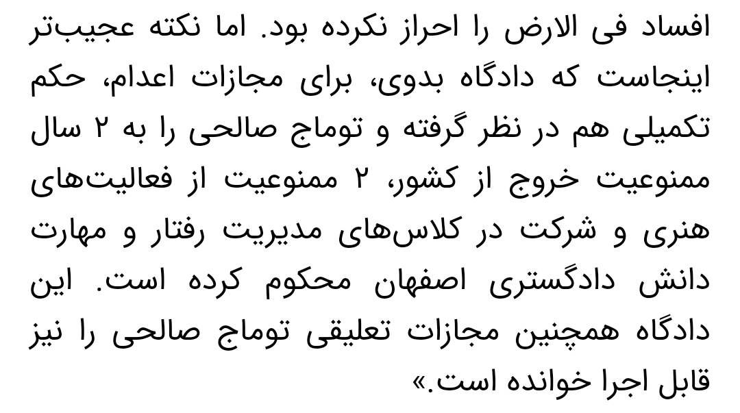 جالبه در حالی گفته میشه #توماج_صالحی محکوم به اعدام شده که در دادگاهش دو سال ممنوعیت خروج از کشور و... آمده