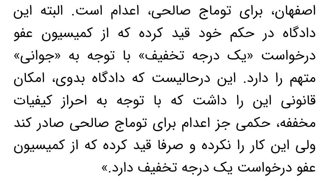 پس معلوم شد بر فرض صدور حکم اعدامی برای #توماج_صالحی این حکم بدوی هست و خود دستگاه قضایی رژیم اعلام کرده در صورت فرجام خواهی قطعا این حکم شکسته و عفو خواهد خورد