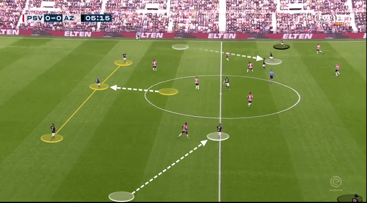 كذلك يعتمد في البناء من الخلف على ثنائي دفاع وثنائي وسط أمامهم ( double pivot )، اللي شاهدناها مرات قليلة مع كلوب، اخرهم ضد السيتي - اندو/ماك