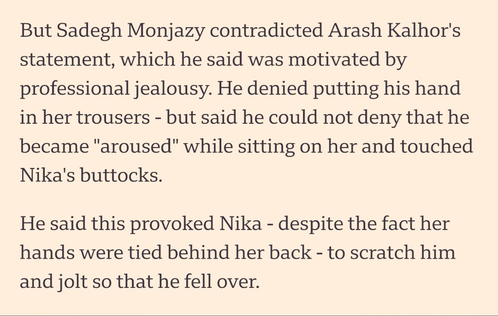 آرش_کلهر میگه بعد از اینکه چراغ موبایلش رو روشن میکنه میبینه که #صادق_منجزی همونطوری که روی بدن نیکا نشسته دستش رو داخل شلوار نیکا فرو برده و دلیل زد و خورد و سر و صدای #نیکا_شاکرمی همین بوده.