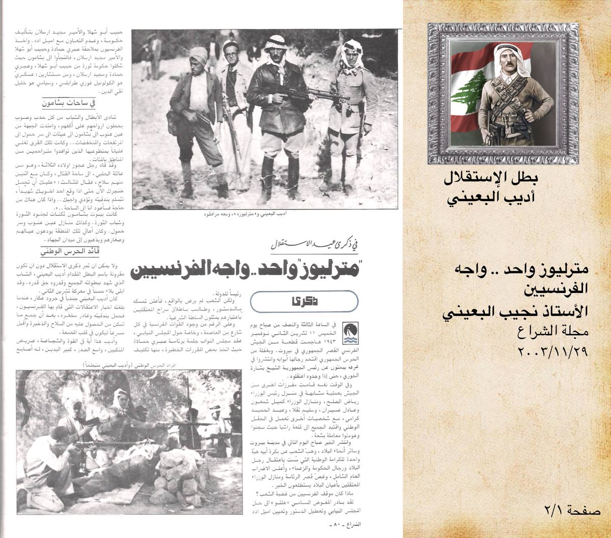 أديب البعيني من مزرعة الشوف كان رأس الحربة في معركة الإستقلال 1943 ضد فرنسا من عيتات الى عين عنوب الى بشامون. و اشتهر بالمترليوز و هو السلاح الرشاش النوعي الوحيد على تلك الجبهة. و قد "قفاه" كتاب التاريخ المدرسي. -