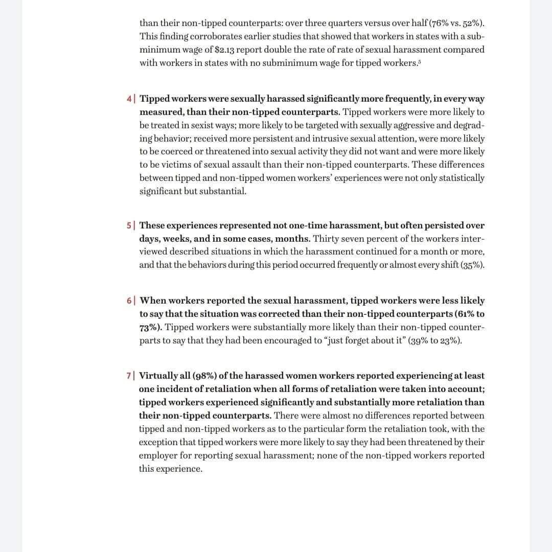 وقال التقرير أن النساء اللواتي يتلقين الإكرامية يتعرضن بنسبة أكبر للتحرش الجنسي.