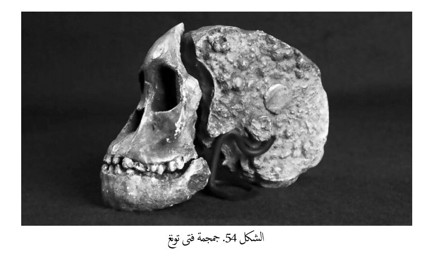 6( أوسترالوبيثيکوس أفریكانوس Australopithecus africanus القرد الجنوبي أفريكانوس هو شبیه قرد آخر تم اكتشافه سنة 1924 ويتراوح عمرد بین 3.3 و2.1 مليون سنة مضت، تم العثور على عدة عينات منه أشهرها ما يسمى بعينة Taung 1 أوفتي تونغ Taung Child في جنوبي إفريقيا، وهو مجرد جمجمة متشظية صغيرة . الحجم تشبه جاجم القردة ولا تعطى معلومات كافية عن - هذا الكائن وهيئته )الشكل 54(، لكن الراونة بسرعهم المعتاد وهوسهم الحثيث لإثبات التطور سارعوا إلى تفخيم هذه الأحفورة واعتبروها