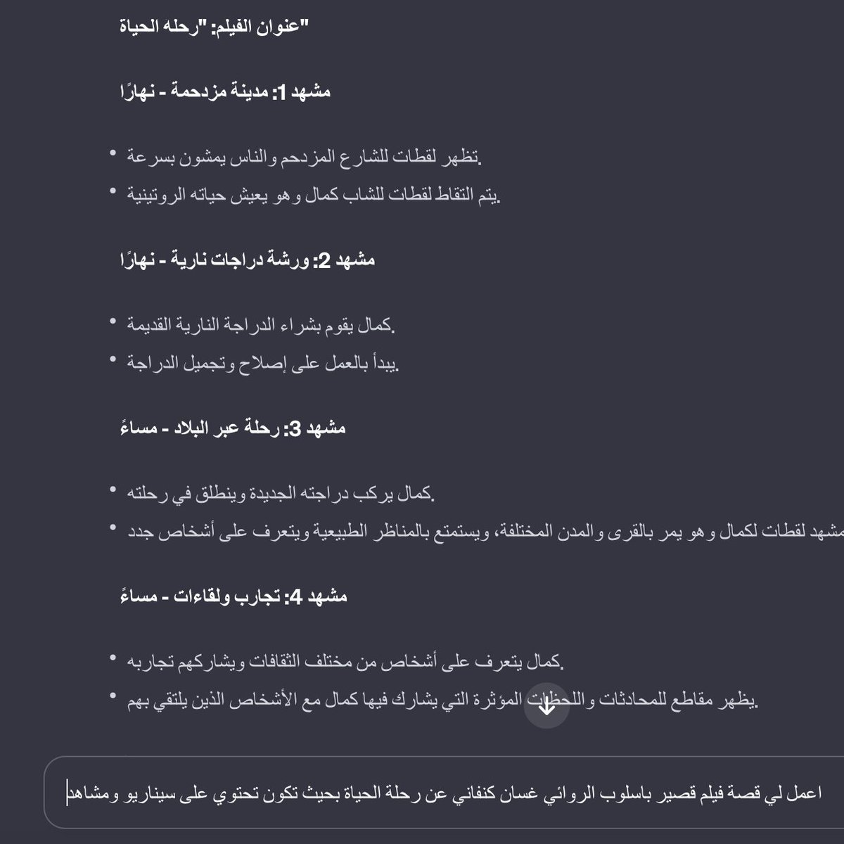 تحويل التلقينات الى صور، هنا تكون انت بمثابة مخرج الصورة او بما يعرف بـ DOP قم بإضافة هذه العناصر على التلقينات السابقة (الاضاءة، زاوية التصوير، نوع العدسة، الموقع، مشاعر الشخصيات وغيرها).