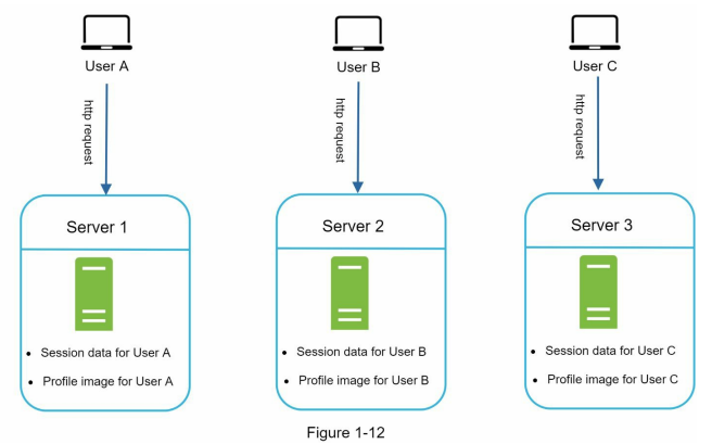 ويوزر C عمل نفس الكلام مع سيرفر 3، بس تفتكر ايه الي هيحصل لو يوزر A بعت ريكويست لسيرفر 2؟ ايوة، مش هيرد عليه بحاجة لإن السيشن بتاعت اليوزر A مش موجودة في سيرفر 2 واحنا اساسًا لما اتكلمنا عن ال load balancer قولنا ان هيكون عندنا اكتر من سيرفر الأبلكيشن بتاعنا شغال عليهم