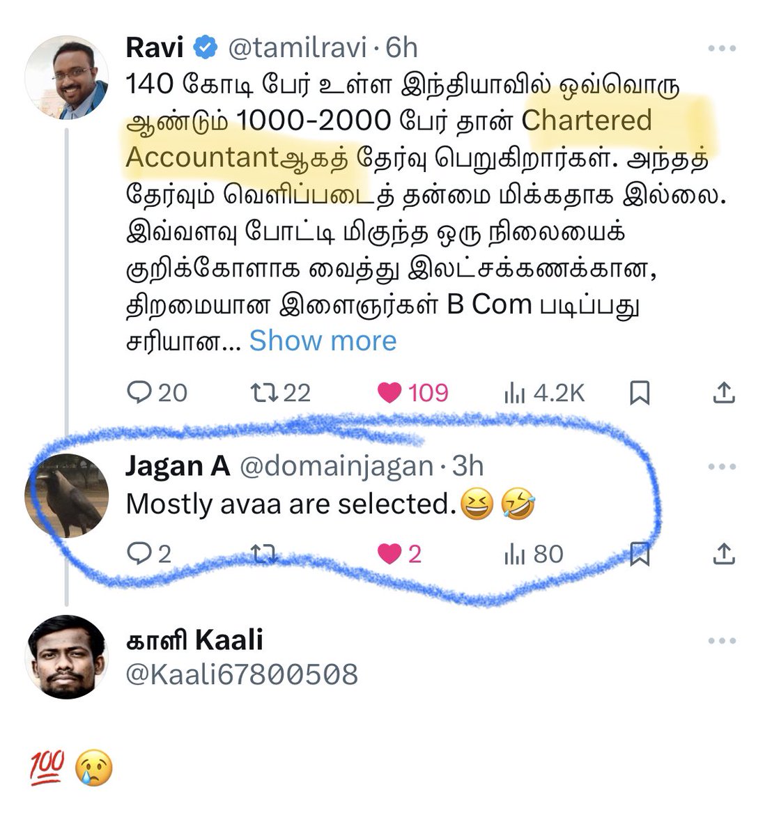 தமிழ் நாட்டில் மக்கட்தொகையில் 3% இருக்கும் பார்ப்பனர்கள், CA படிப்பில் மிக அதிக அளவில் (25% மேலாக இருக்கக்கூடும்) தேர்ச்சி பெறுகின்றனர் என்பது கண்கூடாக பார்க்கக்கூடிய உண்மை.