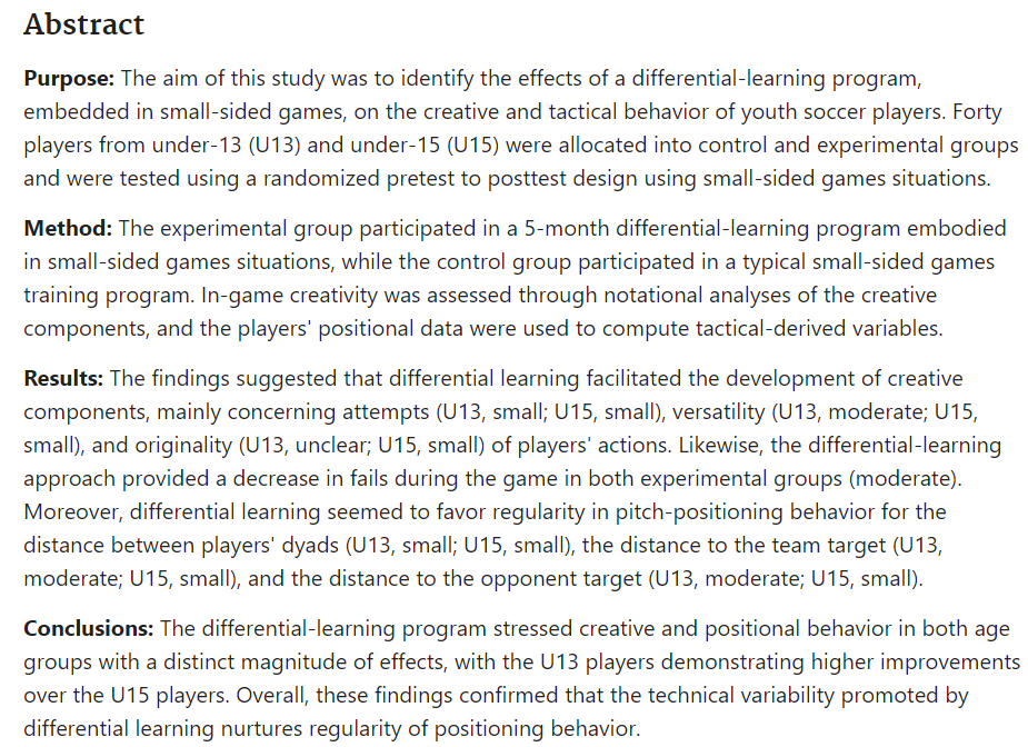 باحثة الإبداع في الألعاب الرياضية الجماعية سارة سانتوس @SaraDLSantos قامت باختبار نظرية "التعلم التفاضلي" على 40 لاعباً ناشئاً في فرق تحت 13 سنة وتحت 15 سنة؛ حيث قامت بتقسيم اللاعبين لمجموعتين من 20 لاعباً وعلى مدى 5 أشهر قاموا بلعب مباريات صغيرة في التدريبات
