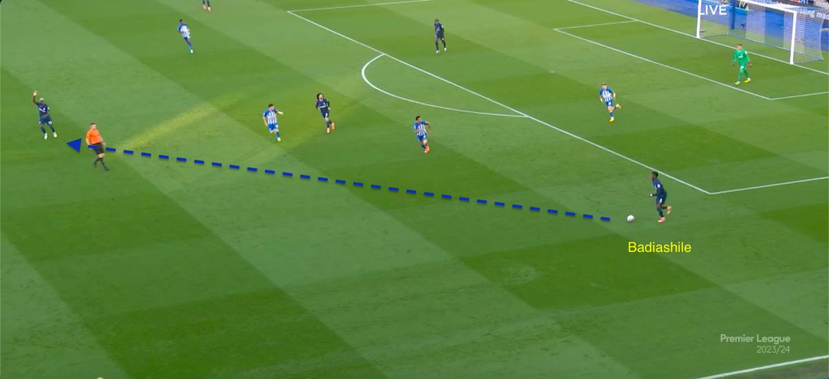 Brighton’s narrow press means Chelsea were able to exploit the wide areas with their CBs (ex: Badiashile).