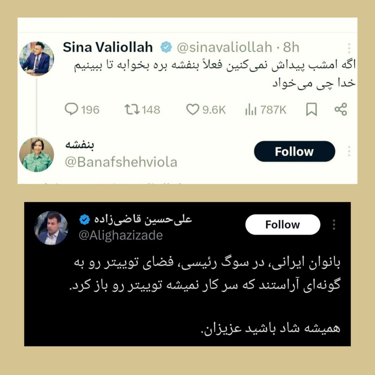 درست دقایقی بعد از خبر سقوط هلی کوپتر رئیسی که می توانست باعث اتحاد ایرانیان برای بازگشت به خیابان بود، اکانتی به اسم بنفشه که سابقه رای دادن برای روحانی و حمایت از ظریف را دارد یک چالش ( نود دادن) را راه انداخت