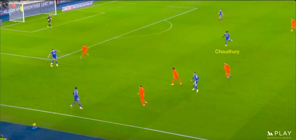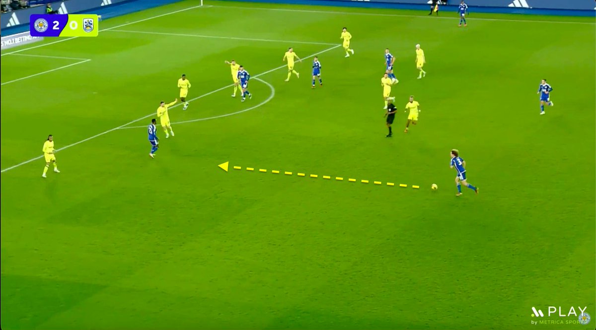 More players in the midfield/attacking line help them to control and sustain the pressure with the counter-press — the problem relies upon Leicester’s CBs being slow (apart from Justin) which creates problems in their defensive transition.
