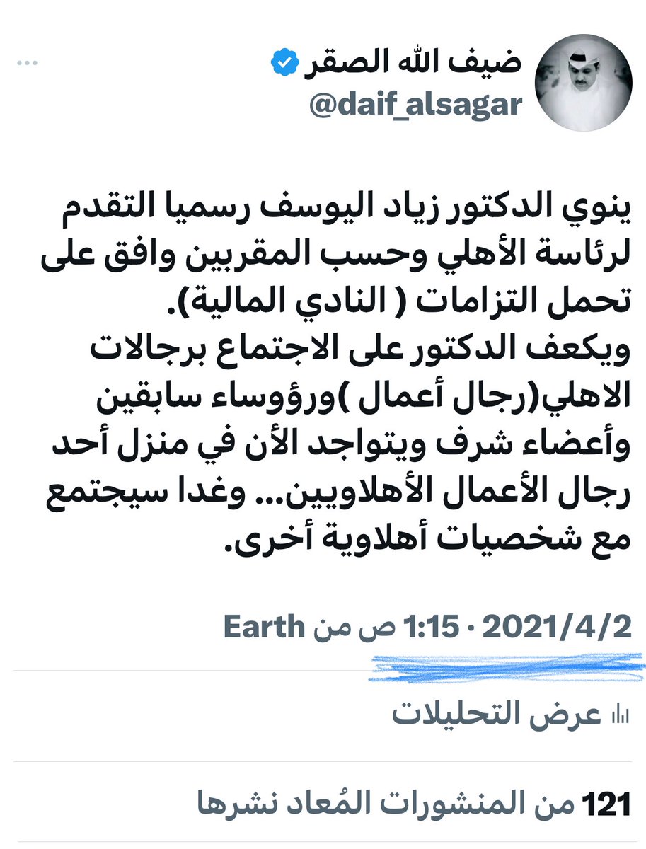 تقدم الدكتور زياد اليوسف كمثل غيره بالتشرف برئاسة النادي الأهلي وطلب مني إعلان ترشحه للرئاسة وقتها وأنه سيوقع على المسؤولية التضامنية التي تمنح الرئيس وقتها عبد الإله مؤمنة السماح له بتقديم أستقالته دون تحميله تلك المسؤولية والتي تصل 37 مليون تقريباً وهي ما كانت مطلب من الجماهير وعدد كبير من أعضاء الشرف .. وتعهد اليوسف بذلك خطياً ..