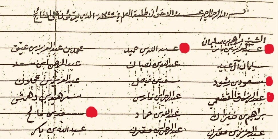 لقد وجدتُ مُصَوَّرَةً عَتيقة مُتداولَة لأسماءِ بعض طلبة العلم الذين كانوا يَدْرُسُون في حلقات الشيخ ابن إبراهيم المفتي الأسبق عام 1355هـ 1937م، وألفيتُ فيها اسم الشيخ سعد، والشيخ ابن باز، والشيخ عبد الله بن حميد، والشيخ عبد الرزاق القشعمي، والشيخ سعود بن رشود (رحمهم الله) وغيرهم..