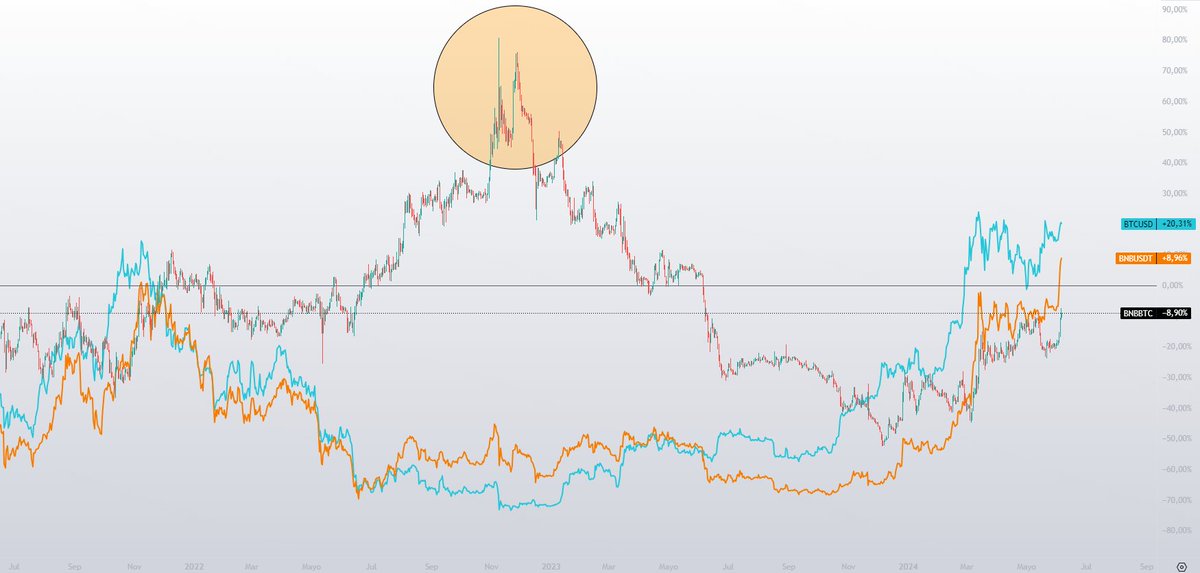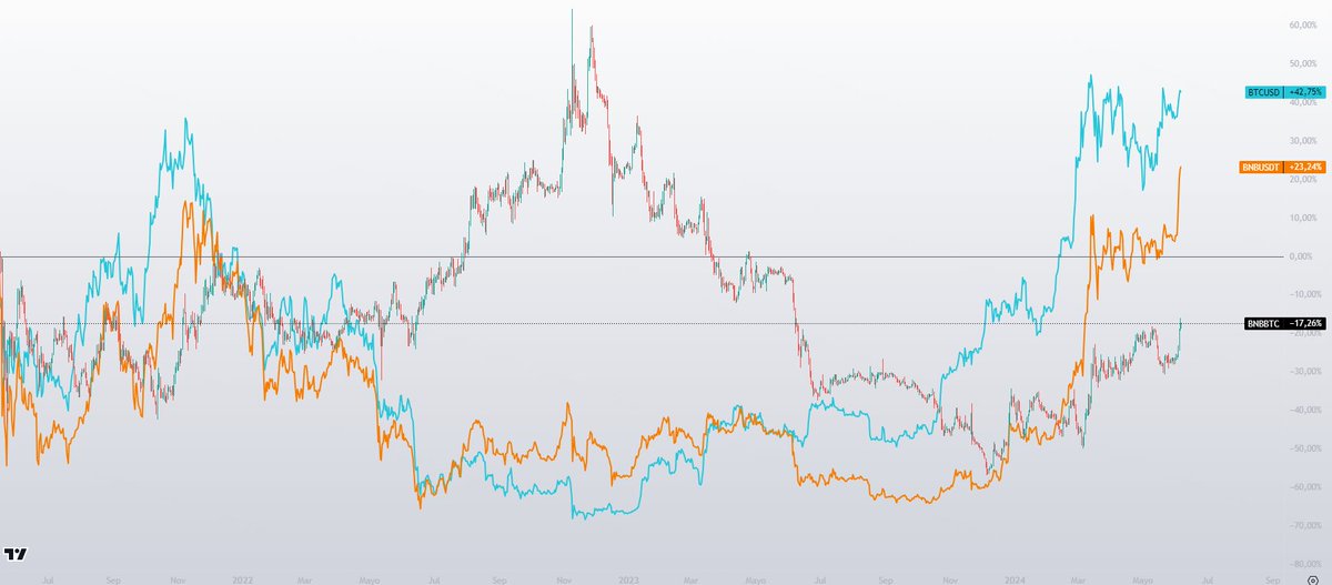 Esto obviamente es un ejemplo más que evidente, BNB es una moneda muy muy operable, de hecho llevo trabajando con ella años y es muy sencillo de tradear, más allá de eso, este ejemplo es perfecto para que entiendas la razón de por qué el par USDT es engañoso.