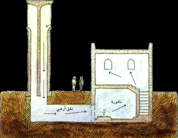 فأصبح الهواء يخرج لطيفًا أيضًا.٤١ لكن طبعًا ليس ببرودة الهواء الذي يمر على ألواح الجليد كما ازدهرت صناعته في العصر العباسي وفي عهد أبي جعفر المنصور العباسي رحمه الله اتُّخذت طريقة أخرى للتبريد، حيث كانوا ينصبون الخيش الغليظ، ويُبقون عليه مبللًا بالماء حتى يبرد الجو.