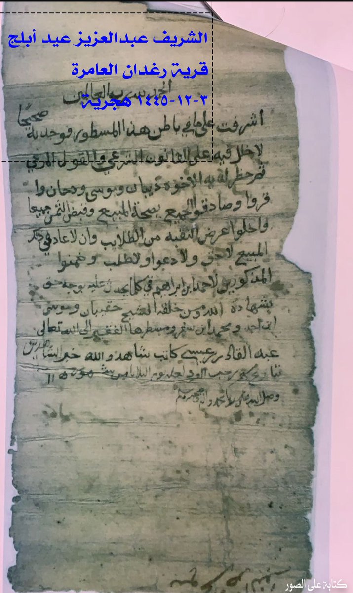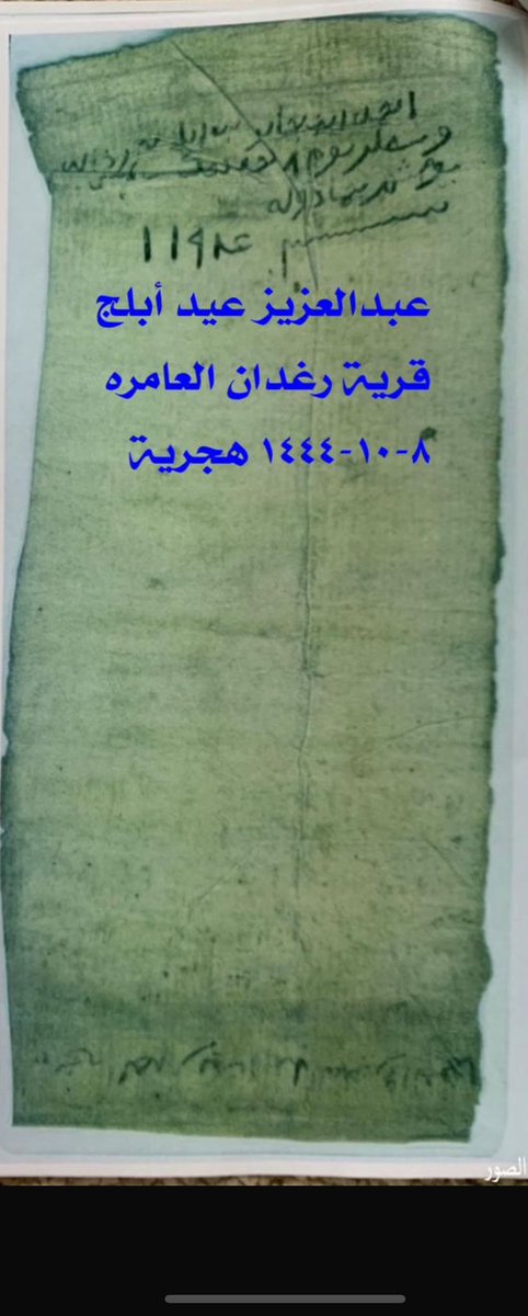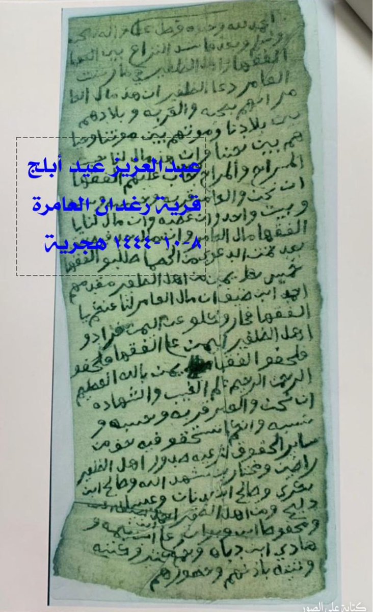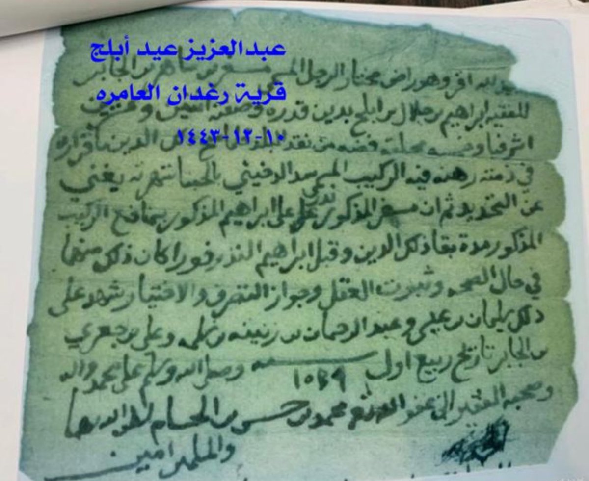 يمين بالله العظيم الرحمن الرحيم عالم الغيب والشهادة ان نحن والعامر قربه وحسبه ونسبه وانكم ما تستحقو افيه حق من ساير الحقوق الشرعية صدور اهل الظفير راضين ومختارين شهد الله وصالح بن بكري وصالح بن عدنان وعيسى ومن أهل الظفير احمد بن ضيف الله ومحفوظ بن وبران وعلي بن نبمه-بنه-