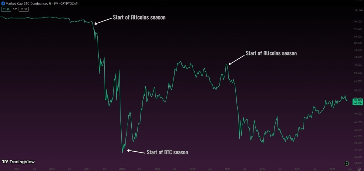 This chart demonstrates how key resistance and support levels are valuable indicators for forecasting altcoin or BTC seasons.