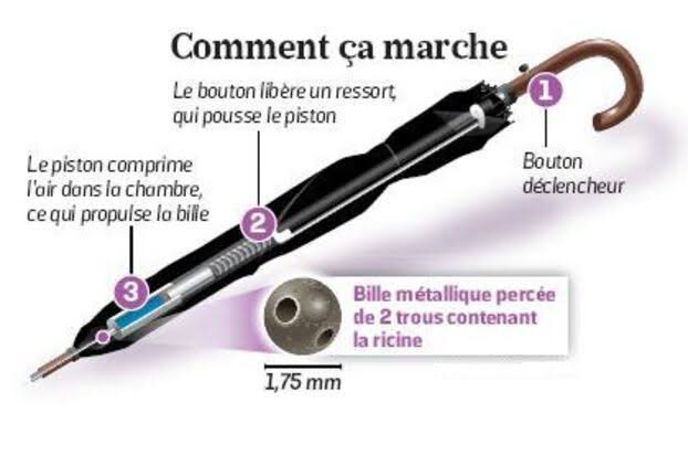 في اليوم الثالث، توفي جورجي في المستشفى، تاركًا الأطباء في حيرة من أمرهم. تم إجراء تشريح لجثته لاكتشاف السبب، ليجدوا كرة معدنية صغيرة جدًا مدفونة في الجزء الخلفي من فخذه الأيمن، تحتوي على بقايا مادة الريسين السامة.