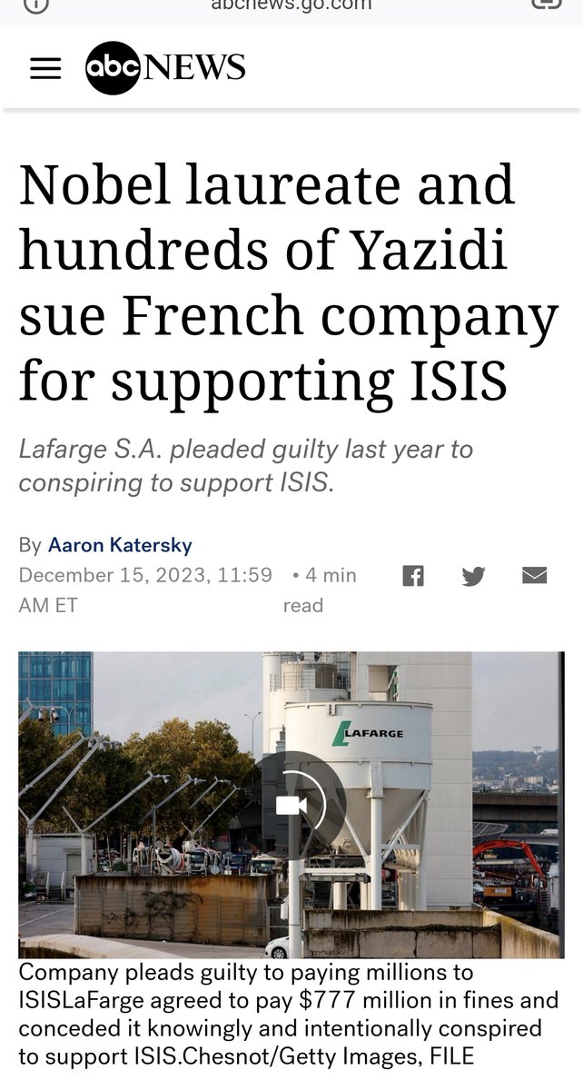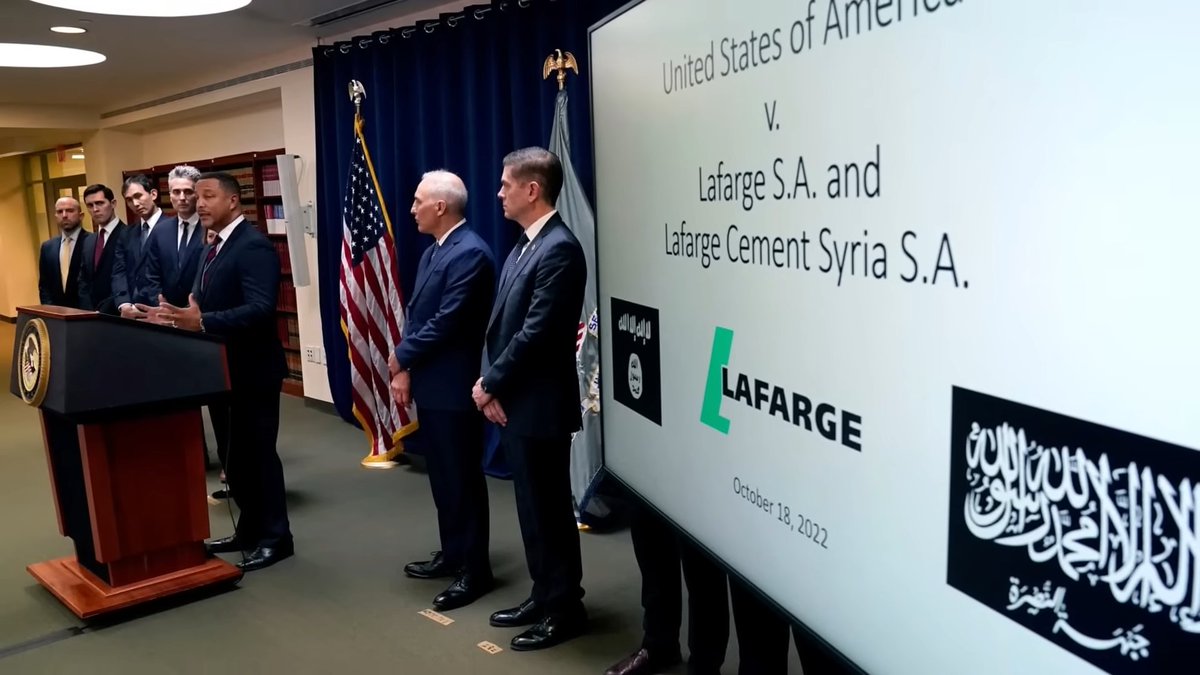 في عام 2018، تم اتهام ثمانية مدراء تنفيذين سابقين في شركة لافارج، بدعم الإرهابيين وتعريض حياة موظفيهم للخطر. كما اتهمت المحكمة العليا الفرنسية لافارج بالتواطؤ في جرائم ضد الإنسانية وذلك عن طريق دعم مادي مباشر لداعش. القضية قائمة ليومنا هذا.