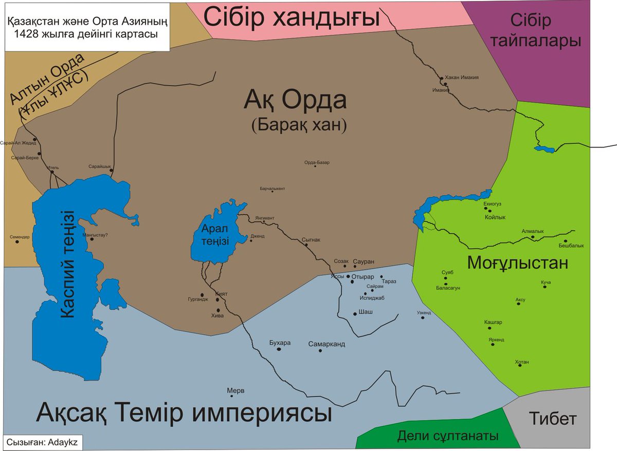 ثم اختار زعماء قبائل وسط وشمال كازاخستان أبا الخير الشيباني خانا في منطقة تورا بسيبيريا الغربية عام ٨٣١ھ، وعمره ١٦ عاما، وهو سليل شيبان من أسرة جوتشي وكانت تحته عدة خانات، عمل أبو الخير على توحيد أراضي شرق سهل القبجاق تحت حكمه.