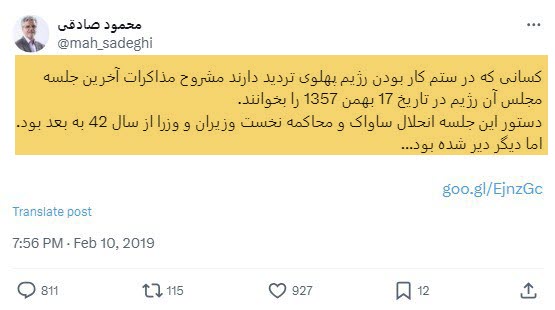 محمود صادقی همان فردی است که به مناسبت چهل سالگی کودتا57 توییت زد و این کودتا را تبریک و آن را شکسته شدن هیمنه آمریکا معرفی کرد!
