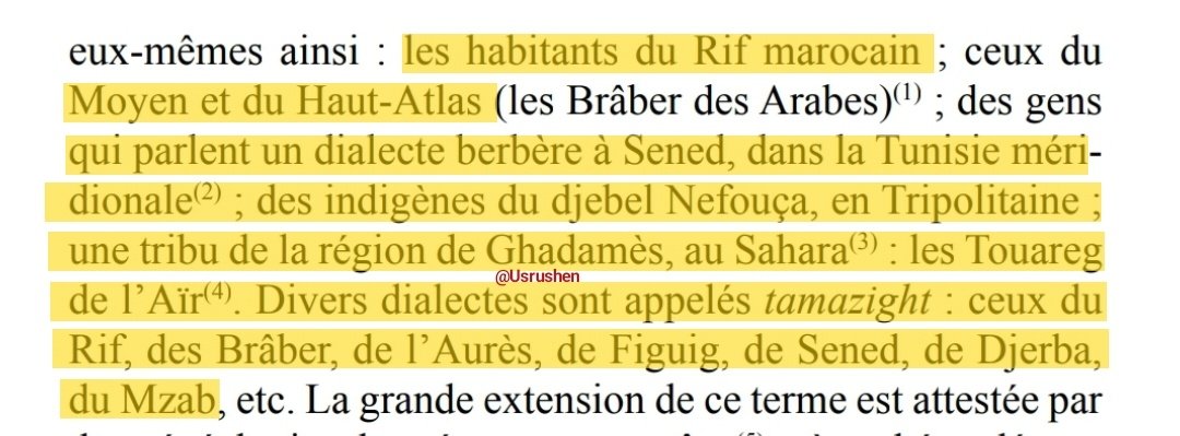 ▪︎و يتكلم عن إسم إيمازيغن كإسم أصيل للأمازيغ الذي يحاول البعض مسحه فيقول :"" وعلى العكس من ذلك #اسم_أمازيغ، وتمزيغت في المؤنث وإيمزيغن في الجمع. فكثير من البربر #يسمون_أنفسهم هكذا، كسكان #الريف المغربي، وأهل #الأطلسين_المتوسطي و #الكبير (هم الذين يسميهم العرب البربر)، والذين يتكلمون لهجة بربرية في الصند بجنوب القطر #التونسي، وأهالي جبل #نفوسة بمقاطعة طرابلس، وإحدى القبائل بناحية #غدامس بالصحراء، و #طوارق العير. وهناك عدة لهجات تسمى #تمزيغت كلهجات الريف، والبرابر، والأوراس وفكيك، وجربة، والصند، ومزاب، وغير ذلك.""!!!