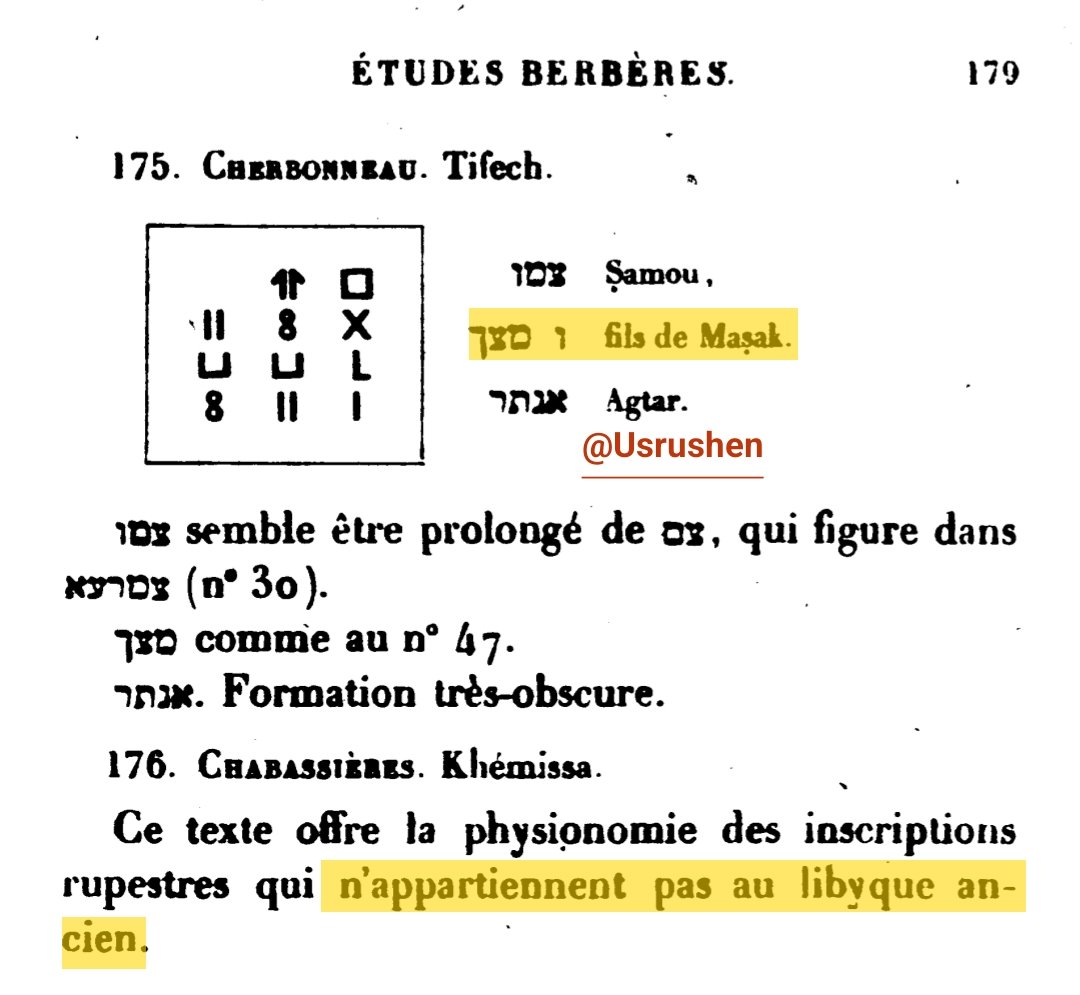 ▪︎و هذا ما يؤكده لنا [Joseph Halévy] في كتاب [Journal Asiatique] عن طربق النقيشات التي تؤكد وجود هذا الإسم #التاريخي_اركيولوحيا و الملاحظة 14 يقول فيها ان MASIK تصف شعب البربر كله [مازيغ] ، مع وجود نقيضة اخرى بإسم [Fils de MASAK ] و هذا يعني ان ما قاله الامازيغ في عصور الإسلام صحيحة [نحن ابناء مازيغ] .