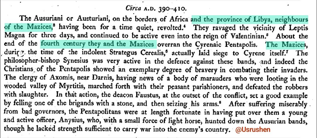 ▪︎ثم على حسب ما ذكره نفس المصدر عاود الامازيغ [المازيس] نفس الموضوع [3] و هذا يعني وجود المصطلح في ليبيا ، و صاحب هذا المصدر يتكلم عن برقة ليبيا الذي اهتم لتاريخ المنطقة الليبية ، و هذه النصوص التي تذكر المازيس او الامازيغ أو #إيمازيغن بنطقنا الأمازيغي يؤكد قدمه و عراقته!