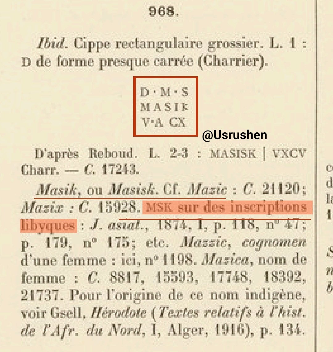 ▪︎ و في كتاب [Inscriptions latines de L'algérie] للمؤرخ و الاركيولوجي [Stéphane Gsell] في النقيشة بالرقم التسلسلي [968] ، نجد إسم [MASIK] بكتابة لاتينية و يقول [MSK] في نقيشة ليبية، مما يؤكد أن الإسم معرزف و منقوش بادلة اركيولوجية #حصرية، فاين اصحاب الخرافات!
