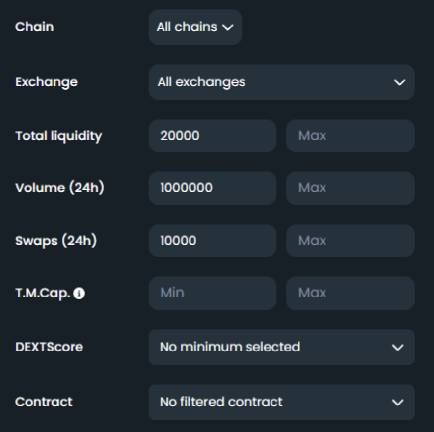 Enter the custom filters as shown in the image below (you can also use these values for Dexscreener)