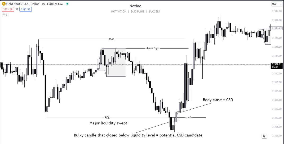 🔱 This is clearest example of them all. Previous daily low (Monday low) swept, bulky down candle that becomes potential CSD candidate and once it got closed by up candle body it is confirmed as CSD.