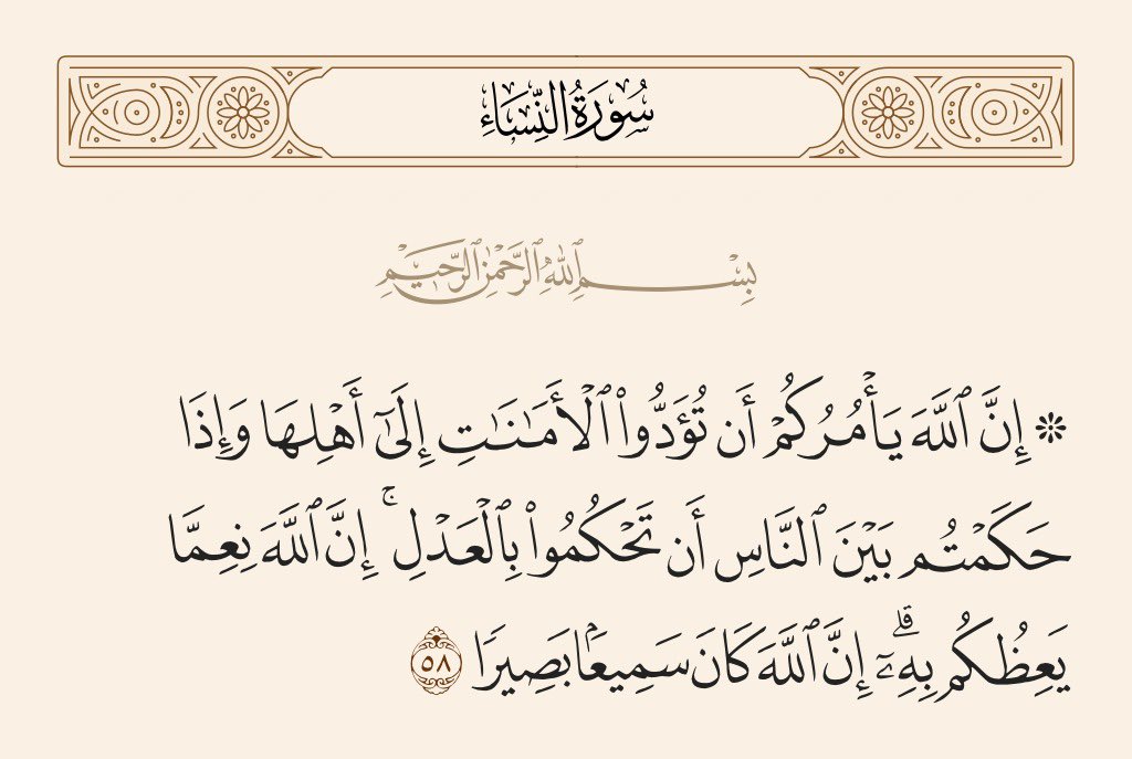 حينها وفي هذه اللحظة نزلت عليه الآية الوحيدة التي تنزلت عليه داخل الكعبة، وهي قوله تعالى من سورة النساء المدنية "إن الله يأمركم أن تؤدوا الأمانات إلى أهلها، وإذا حكمتم بين الناس أن تحكموا بالعدل، إن الله نعمّا يعظكم به، إن الله كان سميعا بصيرا".