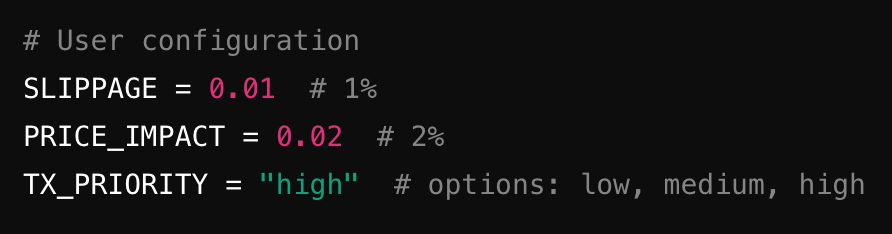 ✜ Be sure to ask to add variables for Slippage, Price Impact, and TX Priority, so you can customize them