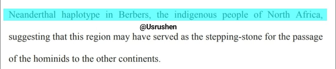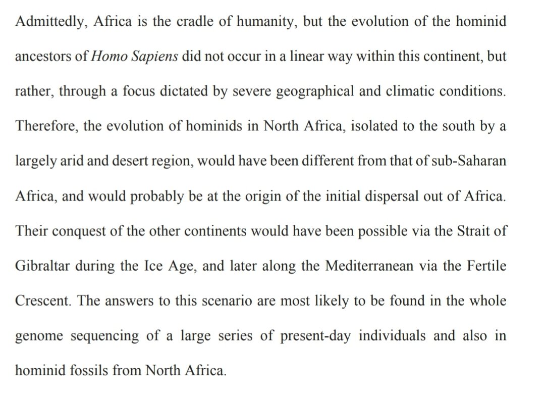 ▪︎ #الضربة18 التي تشرح لما هناك شعبين في إفريقيا و على هؤلاء المنظرين للمركزية السوداء تقبل الحقيقة فقد تطورا بشكل معاكس مما يبعد الأمازيغ عن شيء إسمه افارقة جنوب الصحراء حيث تقول :"" من #المسلم به أن إفريقيا هي مهد البشرية، لكن تطور أسلاف الهومينيد (بشرانيات) للإنسان العاقل لم يحدث بطريقة خطية داخل هذه القارة، بل بالأحرى من خلال تركيز فرضته الظروف الجغرافية والمناخية القاسية. لذلك، فإن تطور الهومينيد في #شمال_إفريقيا، المعزولة جنوبًا عن منطقة قاحلة وصحراوية إلى حد كبير، كان #ليختلف عن تطور جنوب الصحراء الأفريقية، وربما يكون أصل الانتشار الأول خارج إفريقيا""!!