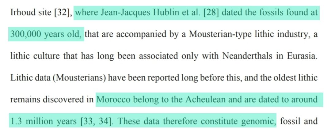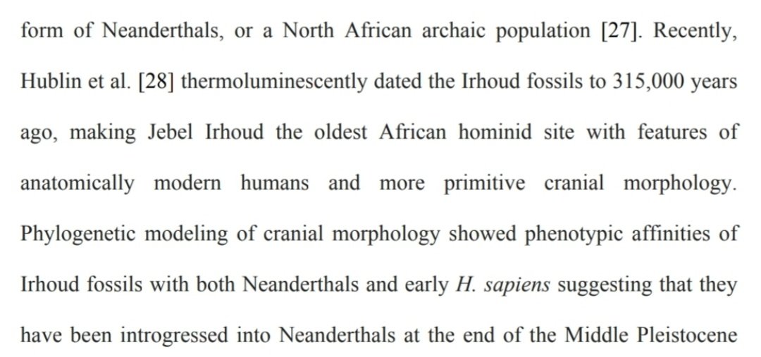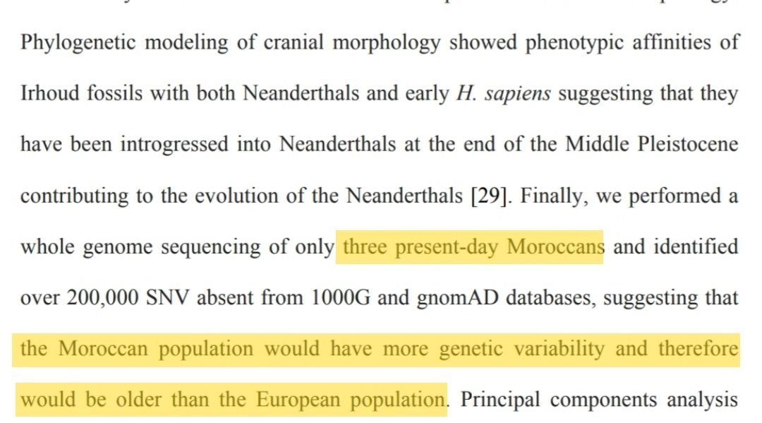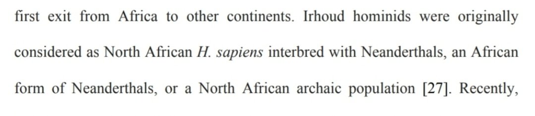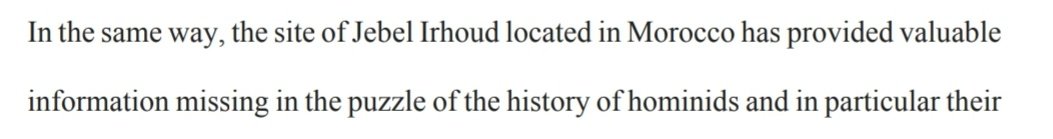 ▪︎و تؤكد الدراسة على اهمية المغرب للعالم حيث تقول الدراسة :"" في الآونة الأخيرة، قام هابلين وآخرون بتأريخ أحافير جبل إيغود باستخدام التأريخ بالترمولومينيس إلى 315.000 عام مضت، مما جعل جبل إيغود #أقدم_موقع للإنسان البدائي الأفريقي يتميز بصفات تشبه الإنسان العاقل تشريحيًا ولكن بتركيبة جمجمة أكثر بدائية.""!