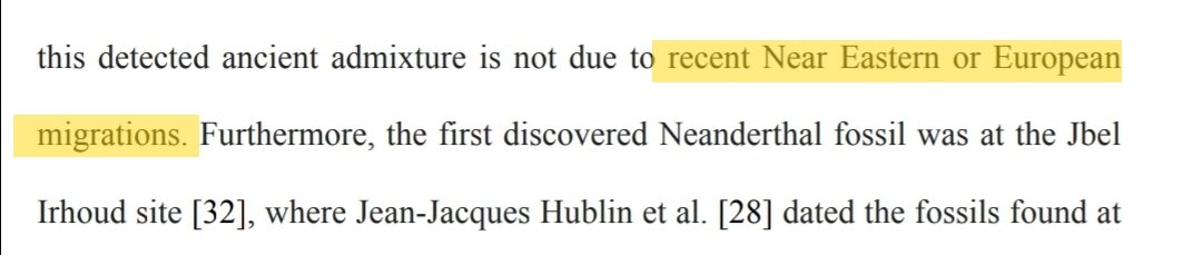 ▪︎#الضربة16 حيث يشكرون ان التاثيرات الجينية لإنسان نياندرتال على المغاربة لا يرجع لهجرات حديثة سواء من الشرق الادنى او اوربا بل التأثير #محلي :"" كما أظهر المؤلفون أن العلامة الجينية للنياندرتال كانت أعلى في السكان ذوي الأصول المحلية لما قبل العصر الحجري الحديث في شمال إفريقيا، مما يؤكد أن هذا الامتزاج القديم المكتشف لا يرجع إلى هجرات حديثة من الشرق الأدنى أو أوروبا.""!!!