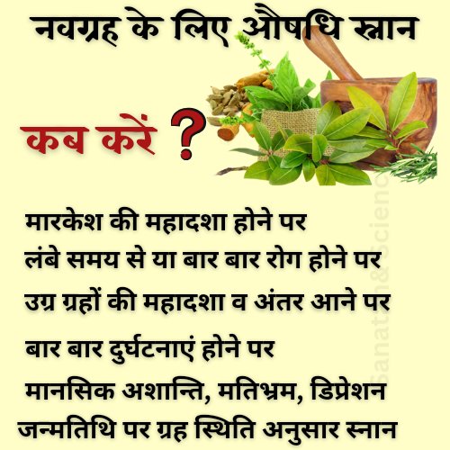 ग्रहो की अनुकूलता अनिष्ट फल को शमन करने और शुभ फल प्राप्ति के लिए औषधियो को जल मे भिगोकर अथवा उनके क्वाथ को जल मे मिलाकर स्नान करना अत्यन्त श्रेष्ठ रहता है ।