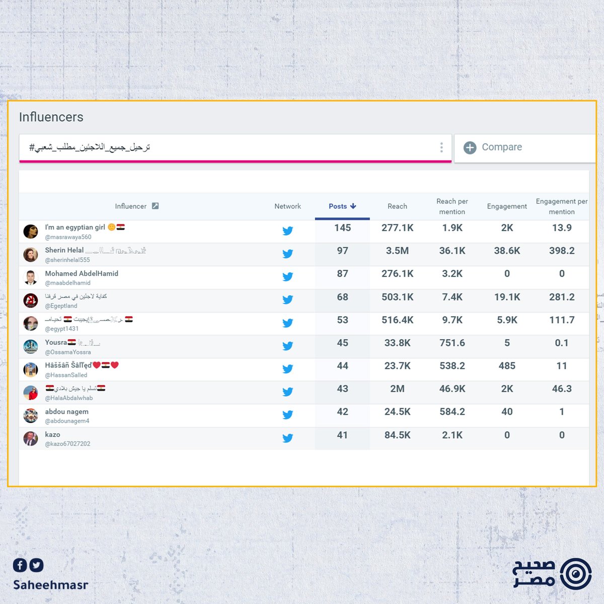 ◾ وأظهر تتبع صحيح مصر لنشاط تلك الحملات، إن لجانًا إلكترونية مؤيدة للحكومة المصرية تقف خلفها وتدعمها، وتعمل على تصاعدها، ووثقنا ذلك استنادًا على تحليل واسع للهاشتاجات الداعية لترحيل اللاجئين السودانيين والسوريين، وتحليل آلاف التغريدات، وتحديد أبرز الحسابات المسؤولة عن انتشار الهاشتاجات.