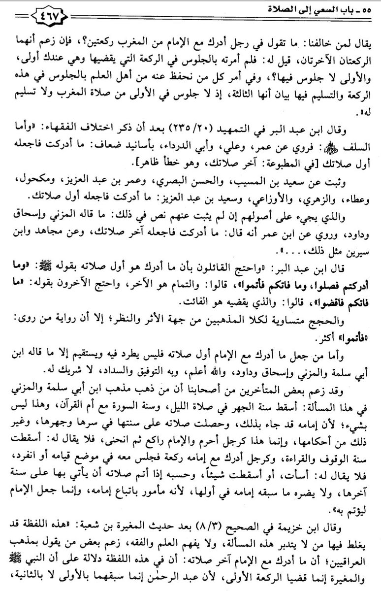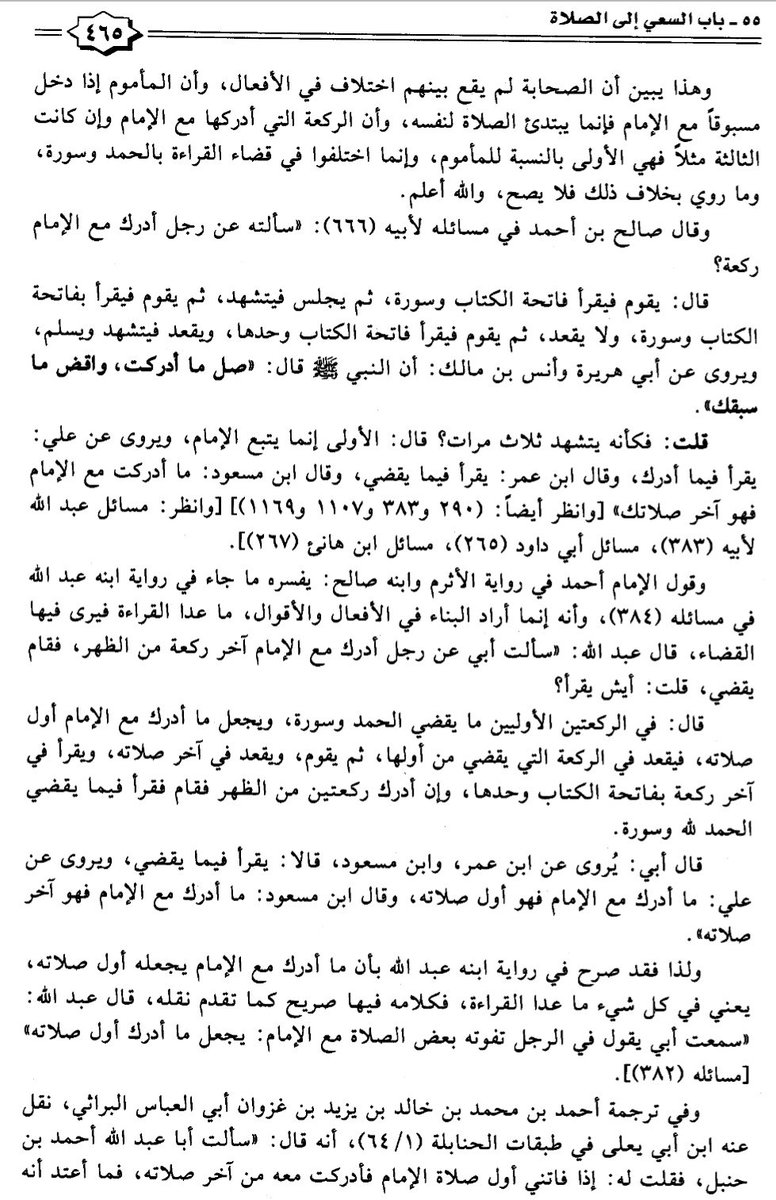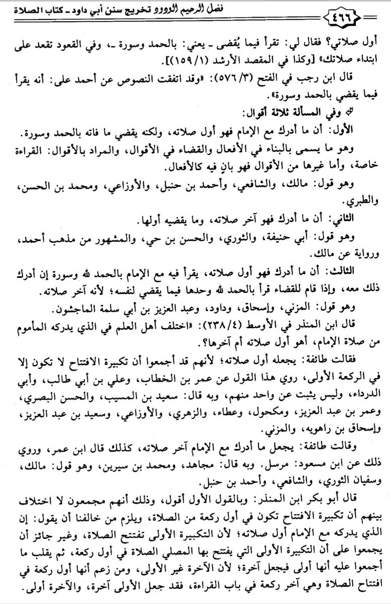 "ولا أعلم خلافا بين الأئمة الأربعة في قراءة الفاتحة وسورة. قال ابن عبد البر: كل هؤلاء القائلين بالقولين جميعا يقولون: يقضى ما فاته بالحمد لله وسورة، على حسب ما قرأ إمامه، إلا إسحاق والمزنى وداود، قالوا: يقرأ بالحمد وحدها".