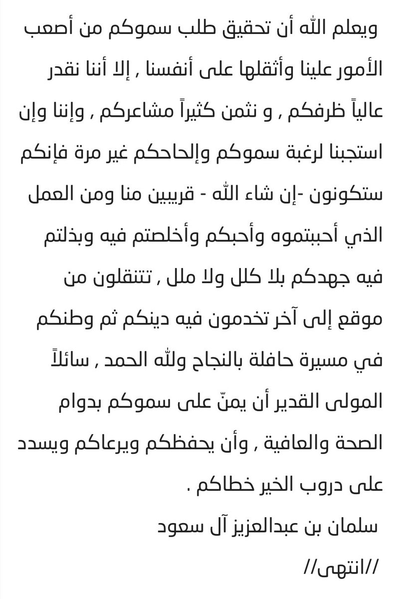 تلقينا طلب سموكم إعفاءكم من منصبكم لظروفكم الصحية، وما حمله الطلب من مشاعر الولاء الصادقة لدينكم ومليككم ووطنكم، وهذا ليس بمستغرب على سموكم.