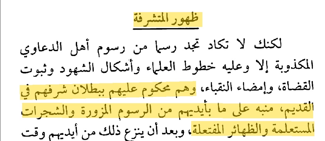 ▪︎و يكشف لنا #المؤرخ_الزياني حقيقة ما آل اليه تزوير الشرف و ادخال من لا شرف له في الاشراف حتى صارت الرعية كلها من الاشراف، فيقول ابو القاسم عن ظهور هؤلاء :"" لكنك لا تكاد تجد رسما من رسوم أهل الدعاوي #المكذوبة إلا وعليه خطوط العلماء وأشكال الشهود وثبوت القضاة، وإمضاء النقباء، وهم محكوم عليهم #ببطلان_شرفهم في القديم، منبه على ما بأيديهم من الرسوم المزورة والشجرات المستعلمة والظهائر المفتعلة""!!