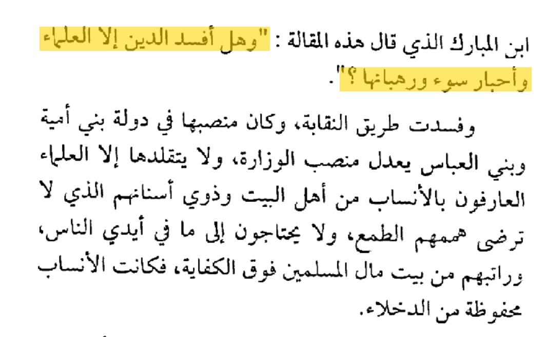 ▪︎""فرحم الله المبارك الذي قال هذه المقالة : وهل أفسد الدين إلا العلماء وأحبار سوء ورهبانها ؟".