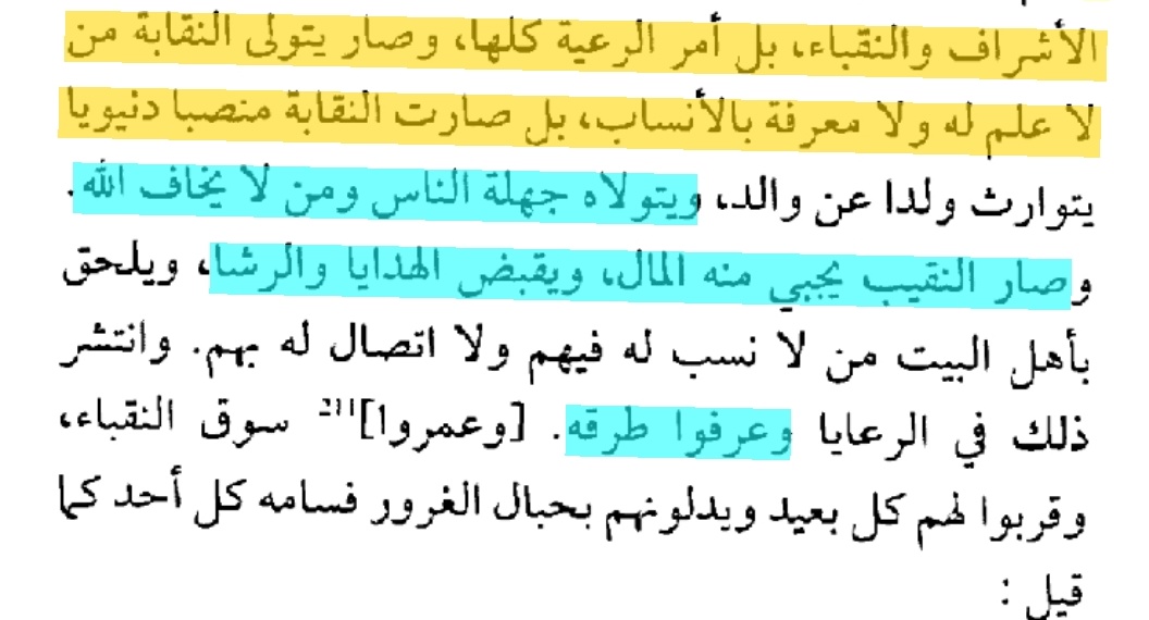 و #فسدت طريق النقابة، وكان منصبها في دولة بني أمية وبني العباس يعدل منصب الوزارة، ولا يتقلدها إلا العلماء العارفون بالأنساب من أهل البيت وذوي أسنانهم الذي لا ترضى هممهم الطمع، ولا يحتاجون إلى ما في أيدي الناس، وراتبهم من بيت مال المسلمين فوق الكفاية، فكانت الأنساب محفوظة من الدخلاء.""!!