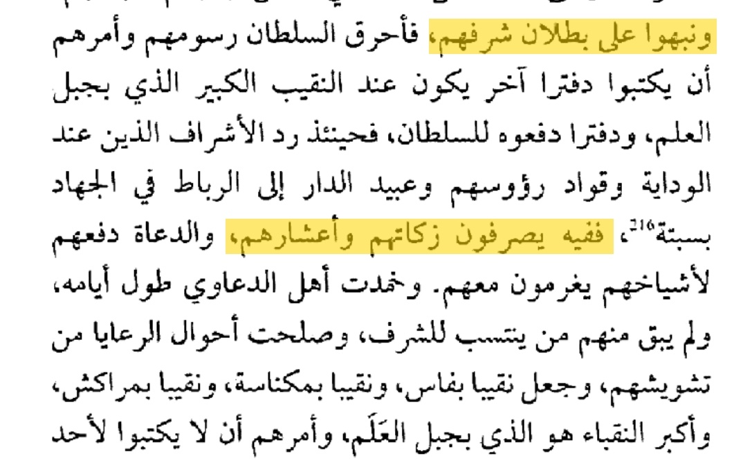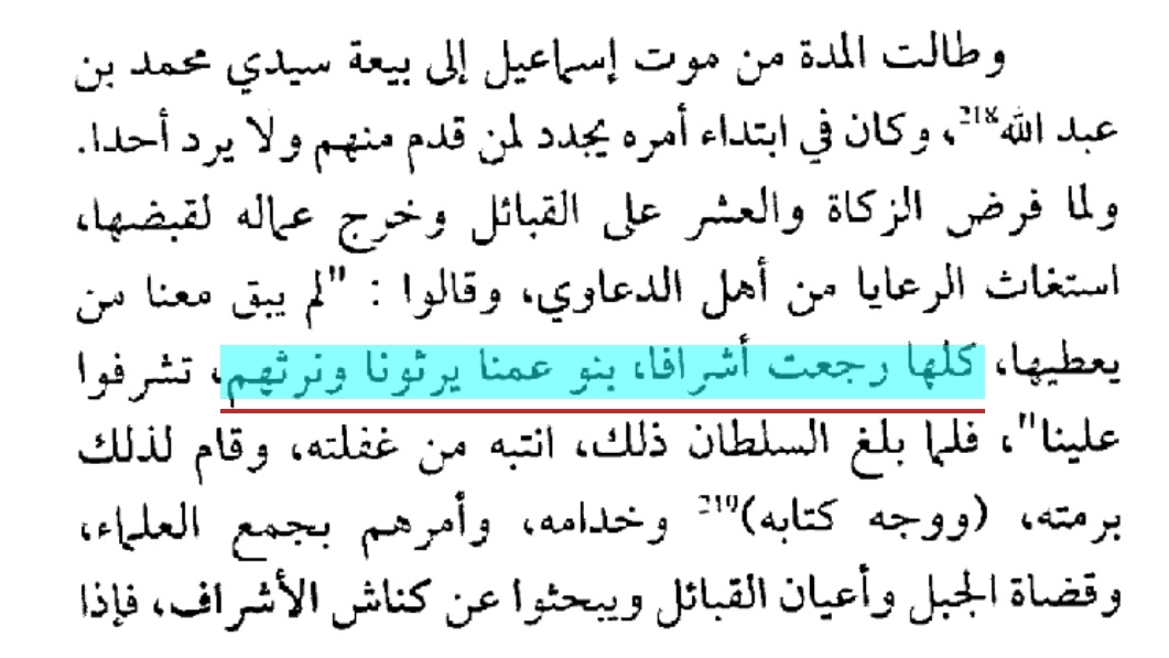 ▪︎و هكذا استمر الحال إلى ظهور السلطان #إسماعيل الذي اوقف هذا التزوير لان المغاربة #كلهم اصبحوا تقريبا #شرفاء و في ذلك يقول :""واستمر الحال على ذلك إلى أن مولانا الرشيد، بل إسماعيل رحمه الله، فوجد أمر #الأشراف_مختلا، وكادت الرعايا أن تصير #كلها_أشرافا، فلما رأى ذلك، صار كل من يأتيه من الأشراف يخرجه من الرعية ويدفعه للوداية أو قواد رؤوسهم أو لعبيد الدار، ويقول لهم : "لا تدفعوا زكاتكم وأعشاركم مع العامة فادفعوها لأخوالي أو لع بيدي أو لقوادي"، فغرقوا في بحر العطاء، كانوا يدفعون مع العامة ( مرة في السنة ) ، فصاروا يدفعون في الفصول الأربعة وأمر السلطان أعيان شرفاء أهل العلم وعلماءهم وقضاة القبائل وأعيانهم أن يعينوا شريفا فقيها عالما بأنساب الأشراف""!!