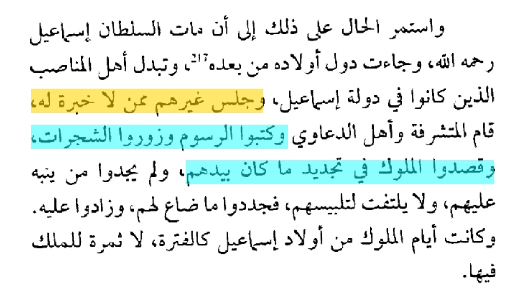 ▪︎☆و #الوزير_الامازيغي_الزياني يعتبر مختصا في الانساب و علومه و تطلع على ارشيف الدولة و الخزانة لهذا لا يوجد لهؤلاء مدعي الشرف اي وسيلة للطعن فيه فيقول بعد ان توفي السلطان اسماعيل عادوا #لتزوير_ضجرة_الآنساب فيقول:"" واستمر الحال على ذلك إلى أن مات السلطان إسماعيل رحمه الله، وجاءت دول أولاده من بعده ، وتبدل أهل المناصب الذين كانوا في دولة إسماعيل، وجلس غيرهم ممن لا خبرة له، قام المتشرفة وأهل الدعاوي وكتبوا الرسوم #وزوروا_الشجرات، وقصدوا الملوك في تجديد ما كان بيدهم، ولم يجدوا من ينبه عليهم، ولا يلتفت لتلبيسهم، فجددوا ما ضاع لهم، وزادوا عليه. وكانت أيام الملوك من أولاد إسماعيل كالفترة، لا ثمرة للملك فيها""!.