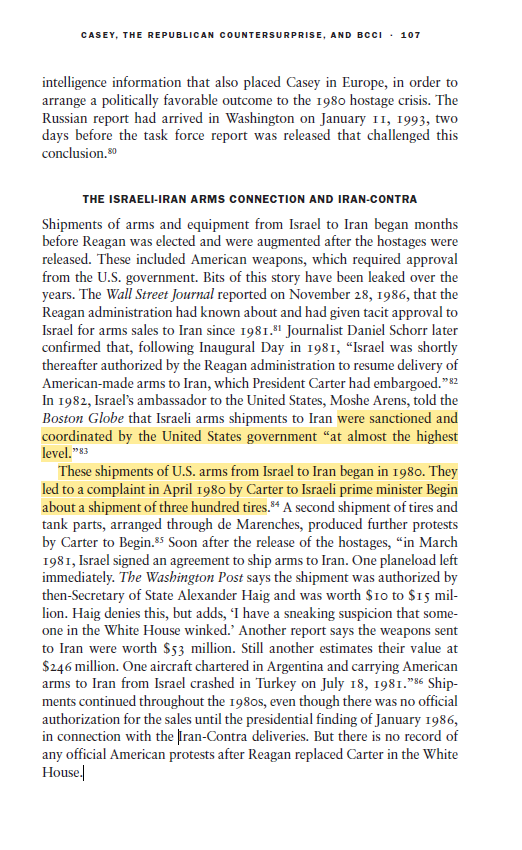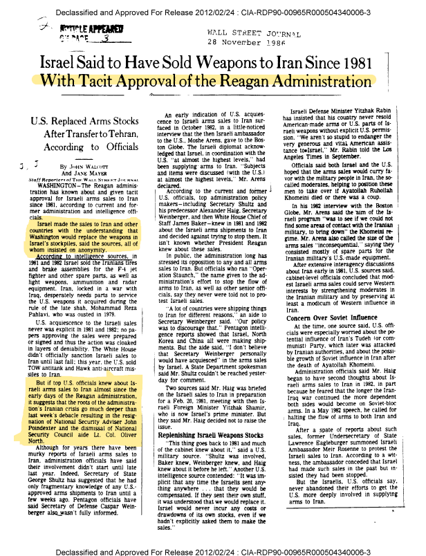 ٦- "رونالد ريغان" اوعز بإيصال الأسلحة في اول أيامه في البيت الأبيض مما فتح الباب لإسرائيل لدعم ايران بشكل لا محدود من الأسلحة والمعدات الحديثة الصنع. تطورت العلاقات إلى ان تم فتح لجنة مشتركة مختصة بين امريكا وإسرائيل للتباحث في نوعية وكمية الأسلحة المرسلة لإيران وبشكل مباشر.