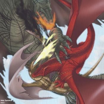 "التقَت التَّنانين بعنفٍ على ارتفاع ألف قدمٍ فوق ميدان المعركة، وتفجَّرت كُرات من النَّار وتوهَّجت ساطعةً للغاية، حتى إن الرِّجال أقسَموا لاحقًا أن السماء امتلأت #بالشُّموس. انغلقَ فكَّا ميليس القرمزيَّان حول #عُنق صنفاير الذَّهبي لوهلة، حتى انقضَّت عليهما ڤاجهار من أعلى. دارَت الوحوش الثَّلاثة هاويةً نحو الأرض، واصطدمَت بها بعنفٍ لدرجة أن حجارةً #تساقطَت من متاريس (استراحة الرُّخ) على بُعد نصف فرسخ."