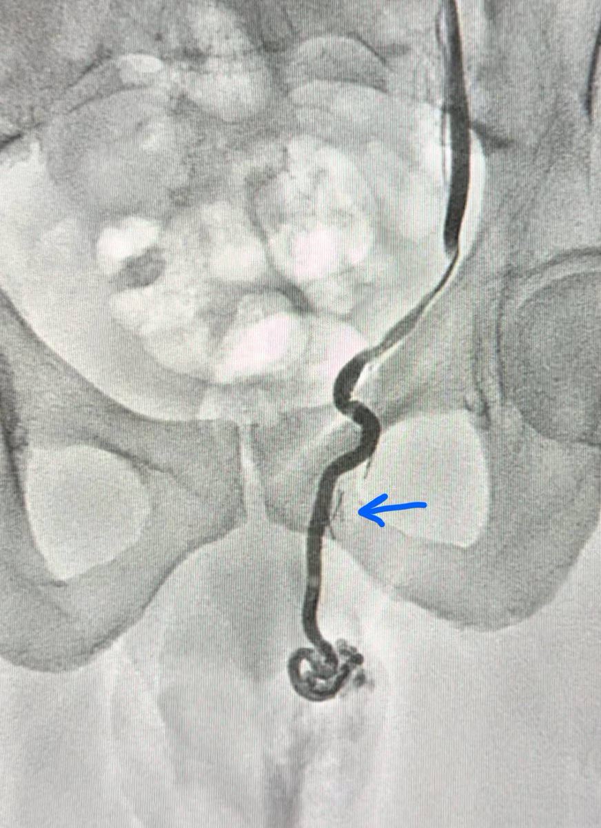 ٢٣- هل القسطرة تعمل بطريقة واحدة؟ كما قلنا مسبقاً يتم اغلاق الوريد الخصوي باللفائف المعدنية او الصمغ الطبي. الاختيار يكون غالباً بناءً على خبرة الطبيب ، توفر الادوات ، التكلفة ، و كذلك حجم ومواقع الأوردة الخصوية. هذه الدراسة وضحت أن الصمغ الطبي هو أفضل خيار بأقل نسبة عودة للدوالي (بسبب تغلغله بالأوردة). كذلك الصمغ الطبي يختفي مع الوقت ولا يبقى له أثر بالأشعة (بخلاف الخيوط الجراحية واللفائف). ماهي عيوبه؟ تكلفته أعلى في بعض المراكز الطبية ويحتاج الى خبرة. بالأسفل صورة لمريض قد سبق وعملت له جراحة فتق إربي(موضح كلبسات تثبيت الشبكة) ، تم تحويله للقسطرة (لاحظ كيف يتغلغل الصمغ الطبي بالأوردة) بحكم أن الجراحة السابقة تزيد من نسبة حصول المضاعفات خاصة موت الخصية.