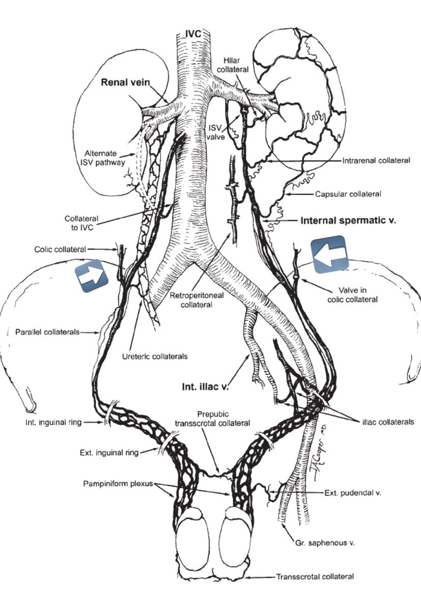 ١٥- هذه الطريقة فشلت بسبب أن الربط يتم بمكان واحد ومن المعلوم ان الوريد الخصوي يغذيه اوردة كثيرة جداً وربطه في مكان واحد غير فعّال ابداً. أوردة كثيرة تتصل بالوريد الخصوي ، منها اوردة جوانب الظهر ، غلاف الكلية ، ووريد القولون (السهم الملون) كما بالصورة المرسوم وبصورة واقعية من اجراء القسطرة والعلاج بالصمغ الطبي. لا تجد احداً من جراحين المسالك يتكلم عن هذه التفاصيل حتى بالدراسات بسبب انها لا تتوضح جراحياً اساساً.