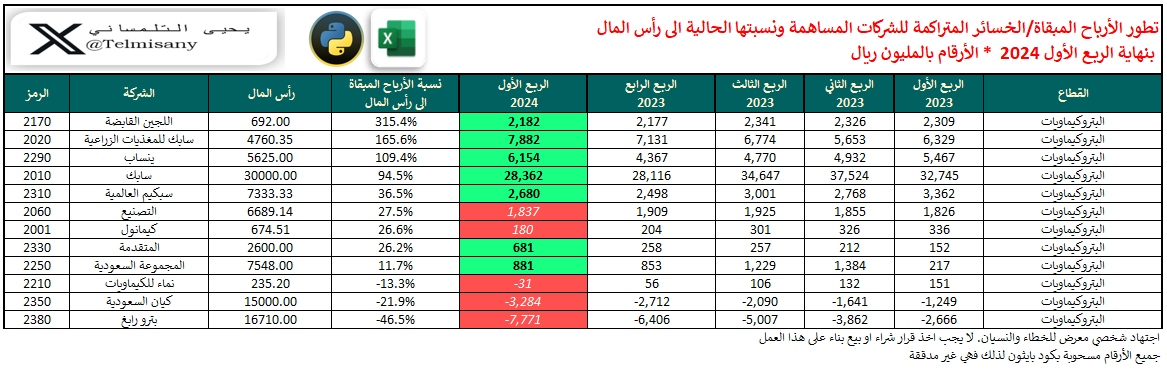 #بترورابغ سجلت نسبة الخسائر المتراكمة إلى رأس المال -46.5% في الربع الأول من 2024، لتصل إلى -7,771 مليون ريال